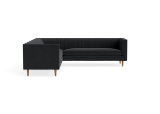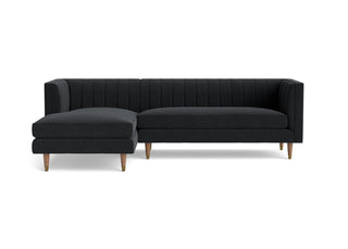 Formal meets playful in the Belmont collection. This shelter arm style sofa features high arms that wrap around the back, creating a simple, streamlined silhouette that looks neat and tidy from any angle. Deep vertical channels pad the inside back and arms and a bench seat with welted seams compliments the sofa’s clean geometry. This collection comes standard with walnut cone legs capped with brass ferrules, but you can dial back the mid-century vibe by swapping in a wood base or metal legs instead.